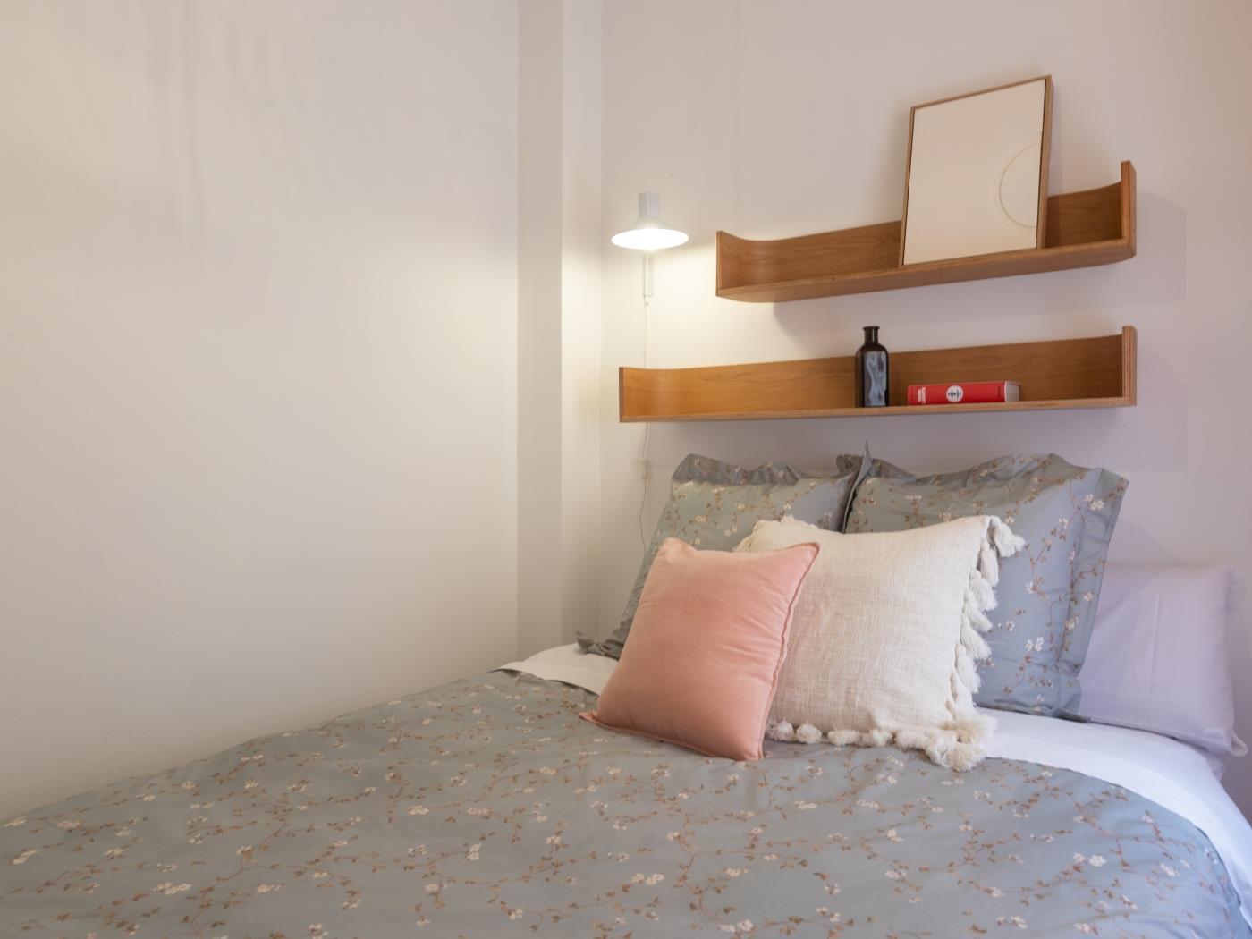 El salón, en el que hay un gran ventanal a una calle tranquila, es muy luminoso. Está equipado con TV, mesa comedor y sofá-cama.