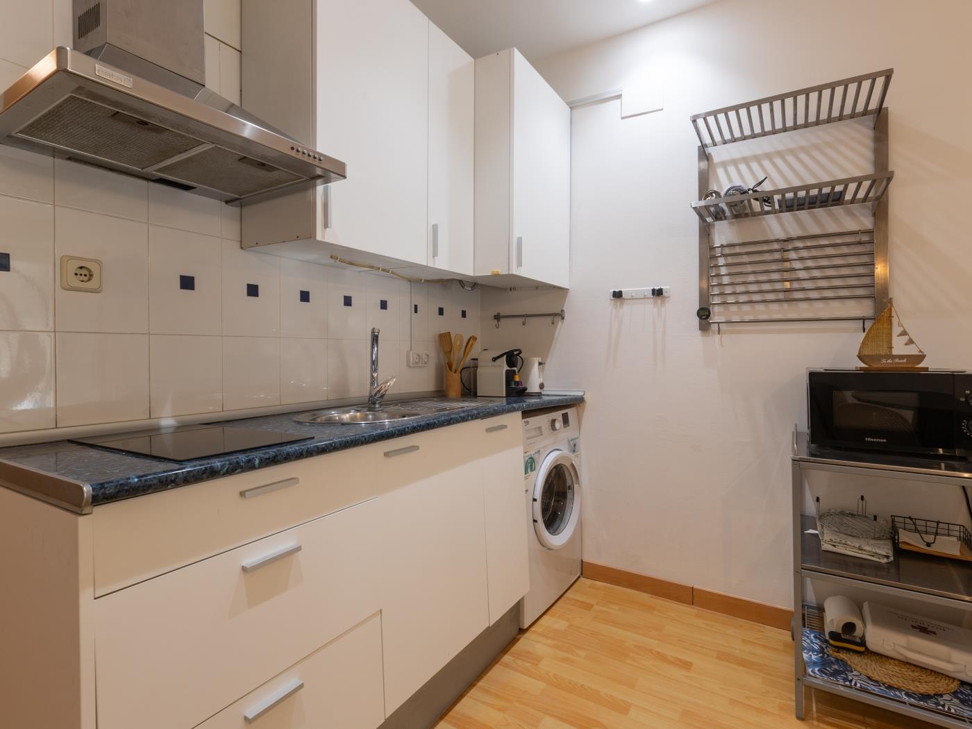 La cocina, abierta al salón está completamente equipada, con microondas, lavadora, cafetera de cápsulas, tostadora, etc.