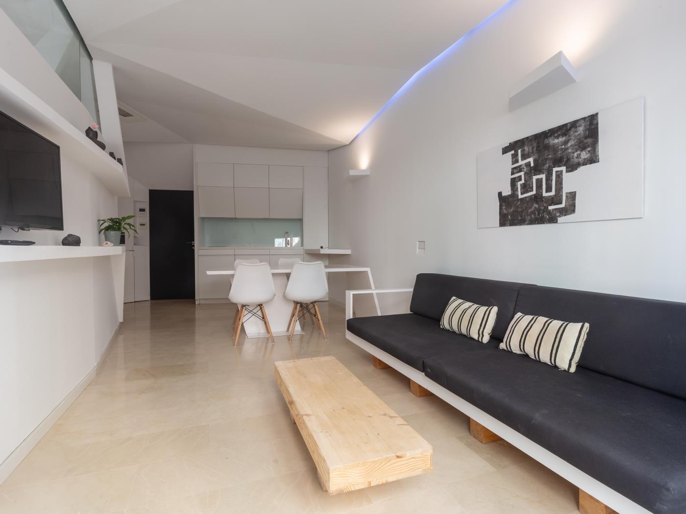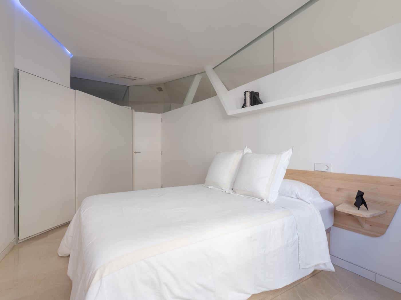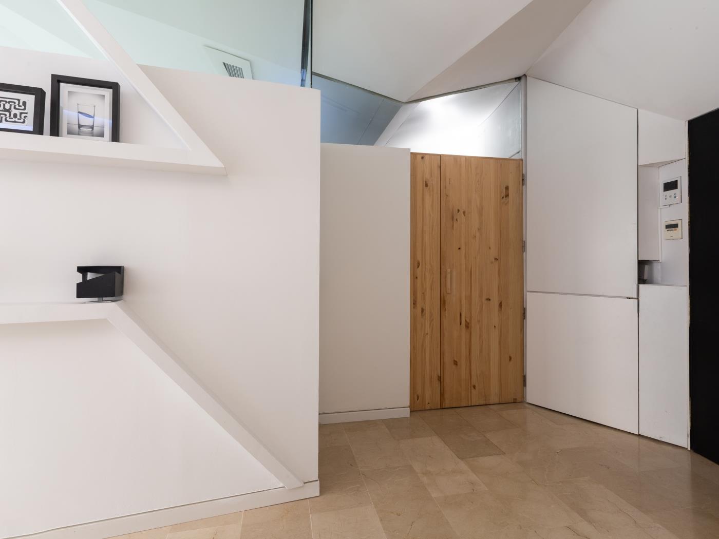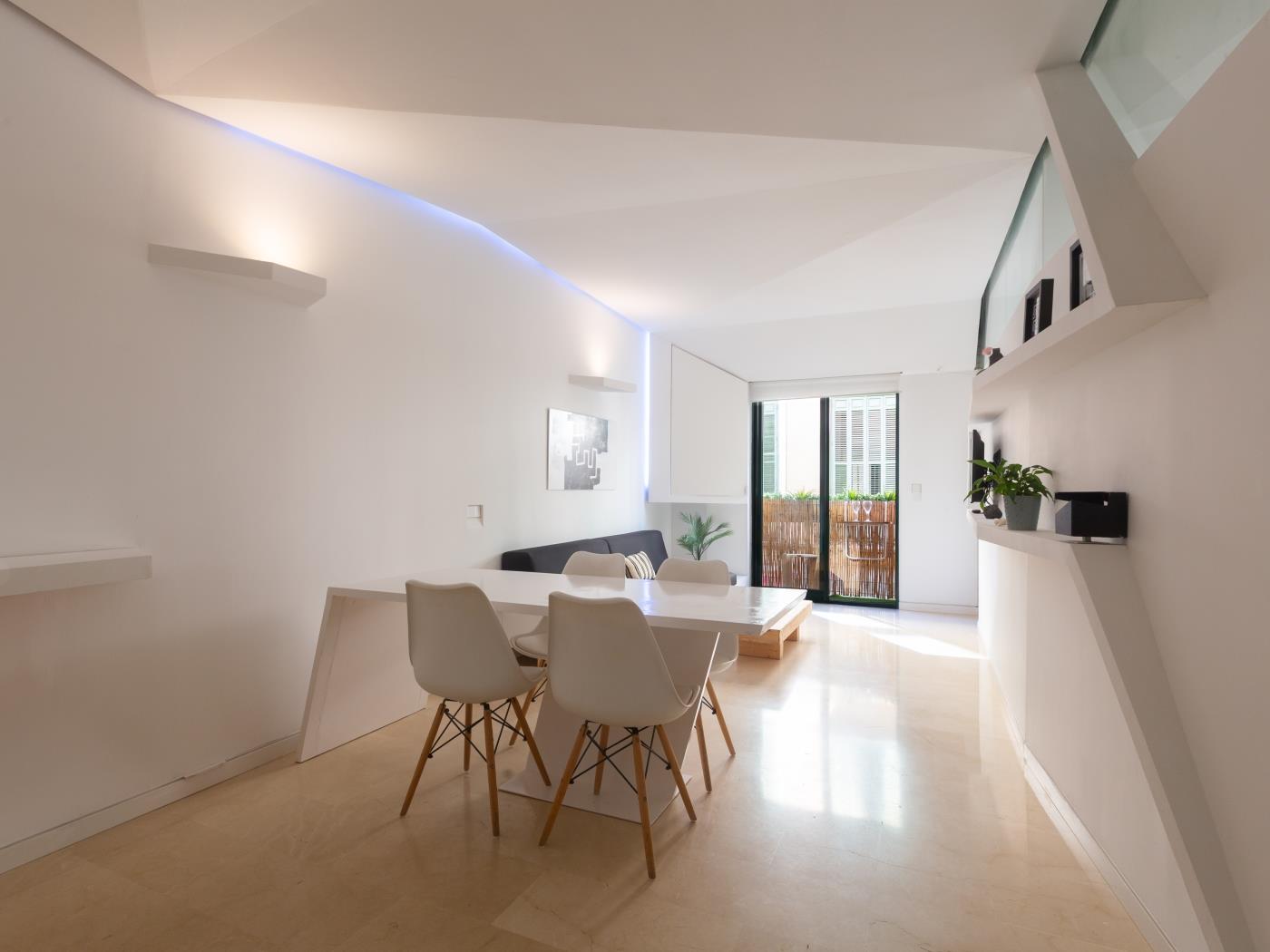 Tiene dos pequeños balcones con vistas maravillosas a la portada-torre de la iglesia de San Juan, una de las más emblemáticas del centro de Málaga. El apartamento destaca también por su cuidada arquitectura, donde destaca el concepto con el que ha sido diseñado su techo, a modo de papel que se va doblando para evocar la técnica del origami, con pliegues que conectan visualmente y formalmente todos los ambientes. Este techo dinámico varía en altura a medida que uno se desplaza, creando un flujo constante entre las habitaciones, dilatando o comprimiendo los espacios. El diseño busca fusionar la tradición arquitectónica del lugar con una propuesta contemporánea que acentúa la sensación de amplitud y movimientoA un lado de la pequeña calle encontramos la iglesia de San Juan y al otro la popular plaza de Camas, con sus conocidos cafés, restaurantes, y una zona de juegos para niños. Situado a solo dos minutos andando del histórico Mercado Central de Atarazanas, y a cuatro minutos andando de la famosa calle Larios.