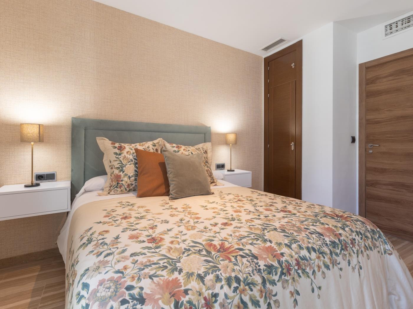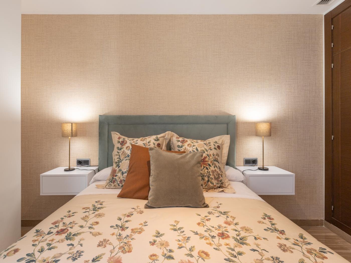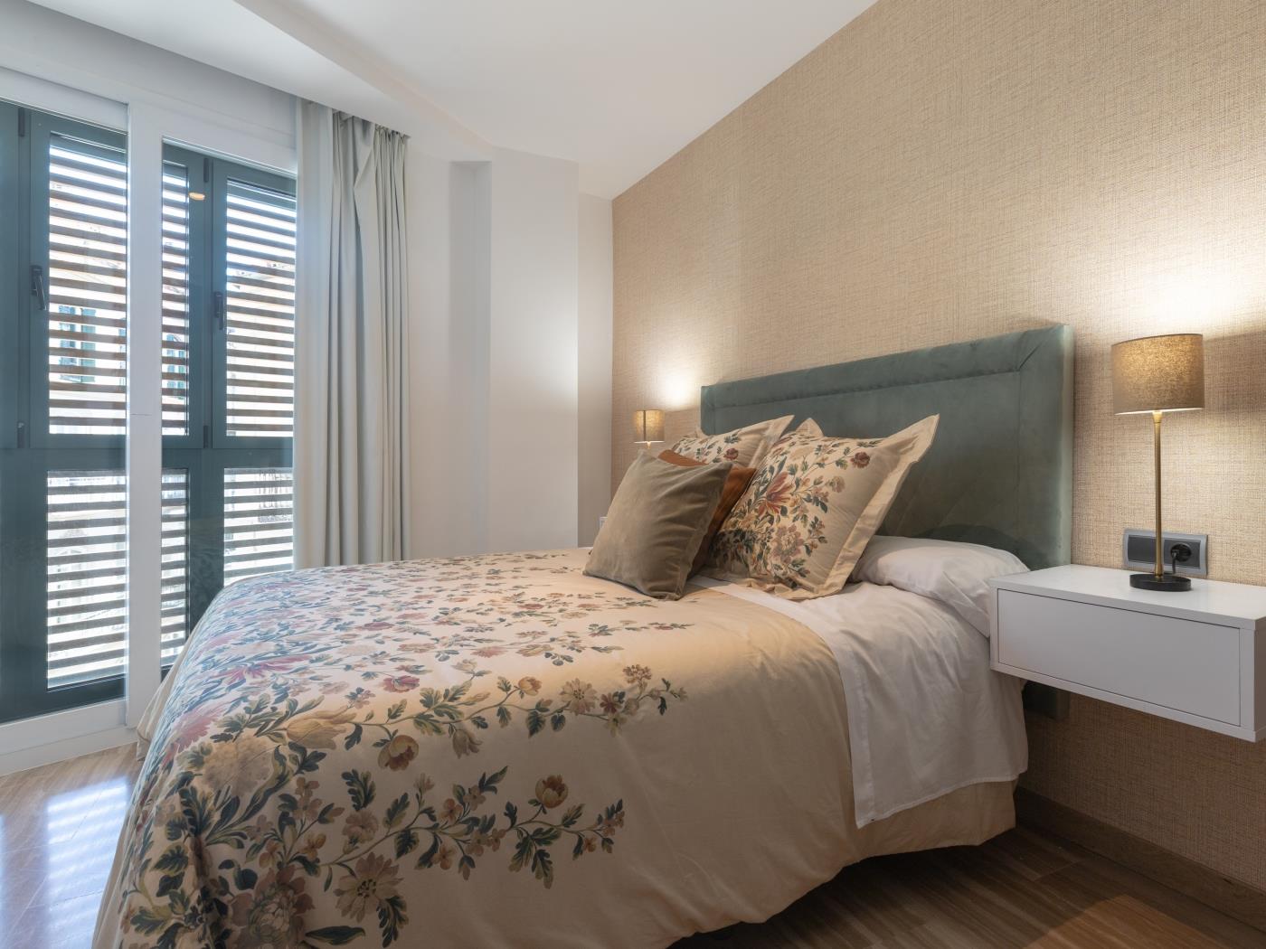 Cuenta con dos dormitorios con cama de matrimonio, ambos dotados de potentes ventanas dobles con gruesos vidrios para aislar del ruido. El salón tiene smart TV, mesa comedor y un sofá. Se trata de un espacio amplio y muy luminoso con un enorme ventanal desde el que disfrutar de unas maravillosas vistas a la plaza de Uncibay. La amplia cocina está completamente equipada y dispone de lavadora, además de un soleado balcón. Wifi gratuito y aire acondicionado (frío/calor). El edificio cuenta con ascensor.