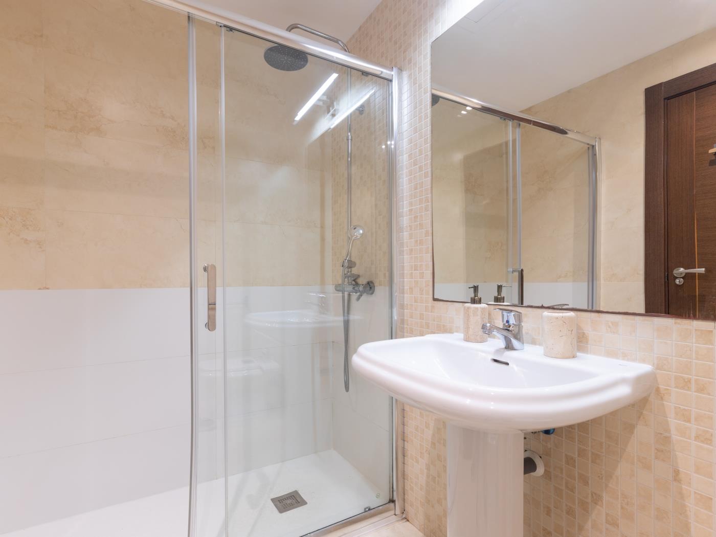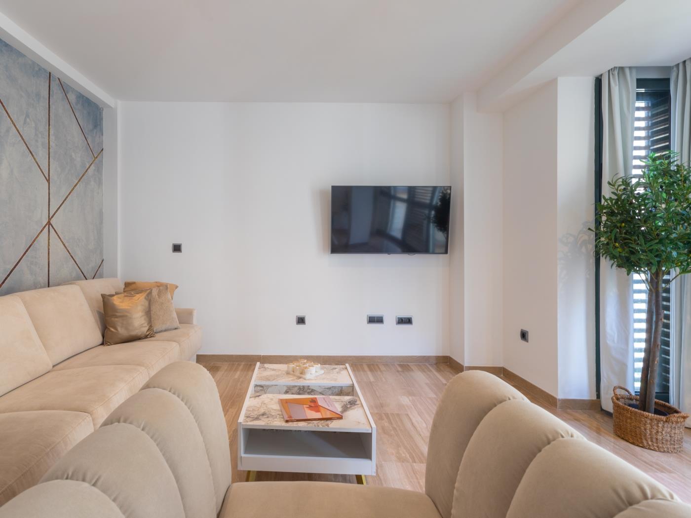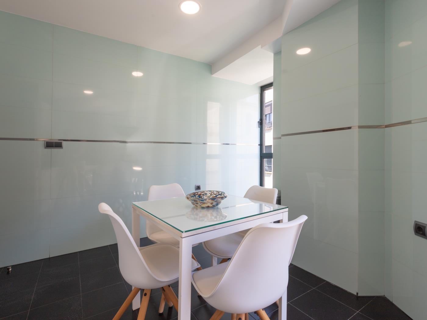 Cuenta con dos dormitorios con cama de matrimonio, ambos dotados de potentes ventanas dobles con gruesos vidrios para aislar del ruido. El salón tiene smart TV, mesa comedor y un sofá. Se trata de un espacio amplio y muy luminoso con un enorme ventanal desde el que disfrutar de unas maravillosas vistas a la plaza de Uncibay. La amplia cocina está completamente equipada y dispone de lavadora, además de un soleado balcón. Wifi gratuito y aire acondicionado (frío/calor). El edificio cuenta con ascensor.